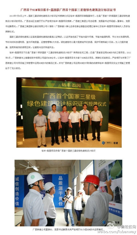 @魯班咨詢:裕豐·荔園項(xiàng)目不僅是廣西首個(gè)榮獲國(guó)家“h星級(jí)綠色建筑設(shè)計(jì)標(biāo)識(shí)”殊榮的住宅工程,還是廣西首家運(yùn)用BIM技術(shù)的工程項(xiàng)目。2012年8月,廣西聯(lián)建與上海魯班軟件有限公司簽約BIM合作,以裕豐?荔園項(xiàng)目作為首個(gè)BIM試點(diǎn)項(xiàng)目 。