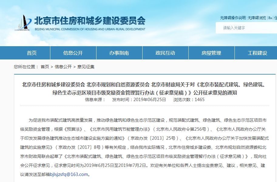 關于對《北京市裝配式建筑、綠色建筑、綠色生態示范區項目市級獎勵資金管理暫行辦法(征求意見稿)》公開征求意見的通知