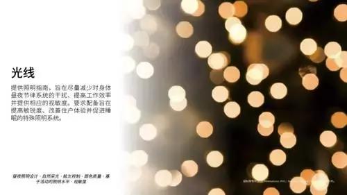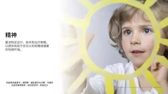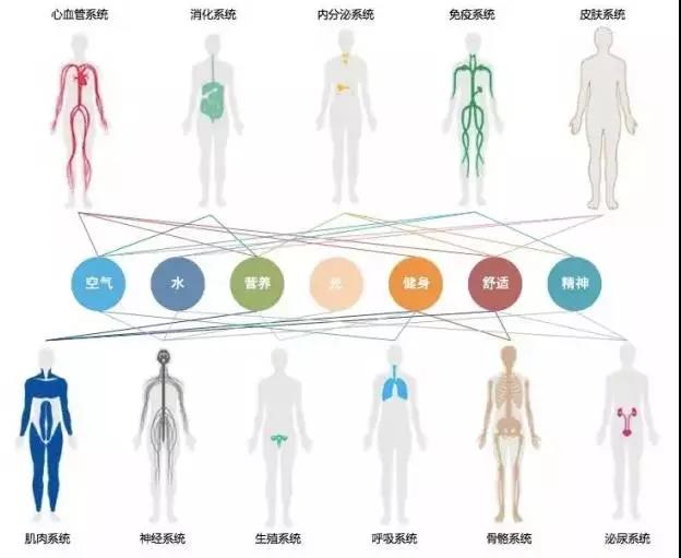 從光、空氣、水、舒適策略通過各方面介入,將支持神經(jīng)和感知功能至于最重要的位置;從營(yíng)養(yǎng)和健身提出策略維護(hù)生殖系統(tǒng)健康;從空氣、健身策略限制環(huán)境中的霉菌和病菌,提供更多的健身機(jī)會(huì),維護(hù)正常的呼吸系統(tǒng)功能。