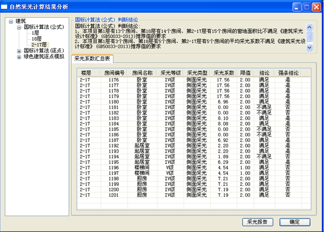 天正自然采光分析軟件以美國Radiance軟件為計算核心,采用窗地面積比估算法、國標公式計數法、模擬計算法等三類計算方式,計算結果滿足《建筑采光設計標準》GB50033-2013和《綠色建筑評價標準》GB/T50378-2014對建筑采光的要求。除可對居住建筑和公共建筑等民用建筑進行采光計算外還可對工業建筑進行采光計算,計算結果準確直觀。計算結果界面截圖: