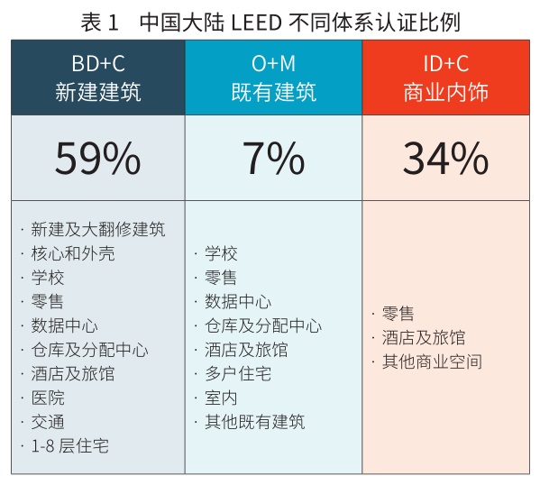 杜日生:目前,這3種認證體系的認證項目在我國的分布情況如下:BD+C為59%,O+M為7%,ID+C為34%。新建項目占比獨占鰲頭。(表1)