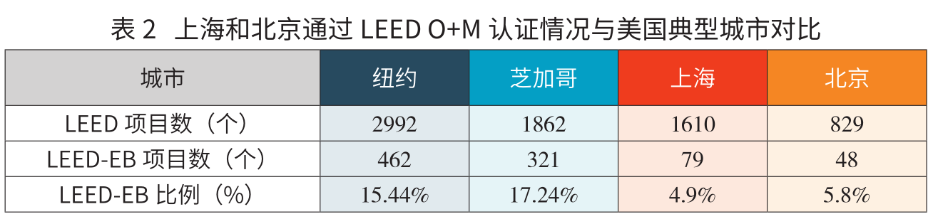 杜日生:目前O+M體系在中國大陸有279個參與項目。我們可以對比一組數據:2017年, 中國大陸有29個O+M項目;到了2018年,這一數字增加到61個,同比增長達到110%。同時,2018年的月均參與量為5個,到了2019年這一數字增加到8個。但是同時我們也可以看到,O+M項目數量在認證體系的分布情況僅為7%。拿上海和北京這兩座國內超級城市來跟美國典型城市做對標后(表2)可以看出,國內的O+M數量占比還是比較低的。在前文中我有提到,既有建筑在國內的綠色煥新發展前景廣闊,從市場趨勢和經濟效益兩方面來看都非常值得我們加以重視及推廣,所以這是很值得討論的話題。