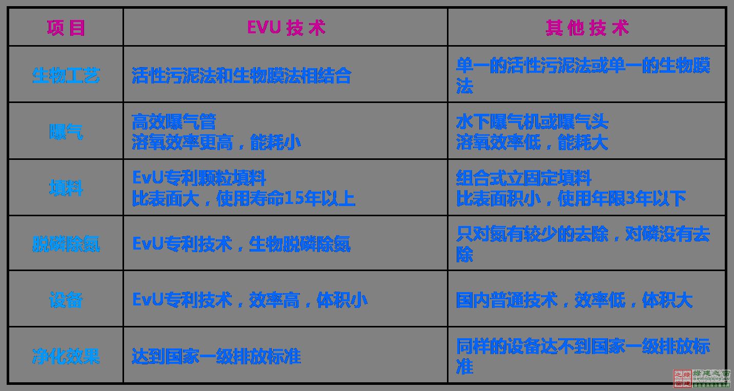 比較說(shuō)明:1.專利填料使用壽命長(zhǎng),15年以上,國(guó)內(nèi)的組合填料使用一段時(shí)間后會(huì)產(chǎn)生污泥膨脹,減少使用年限。2.依靠控制水中溶解氧含量控制脫磷除氮,國(guó)內(nèi)技術(shù)基本沒(méi)有對(duì)磷的處理。目前國(guó)內(nèi)處理生活污水的主要方法是接觸氧化法、活性污泥法、膜法。EVU的技術(shù)在德國(guó)已經(jīng)使用了20多年。