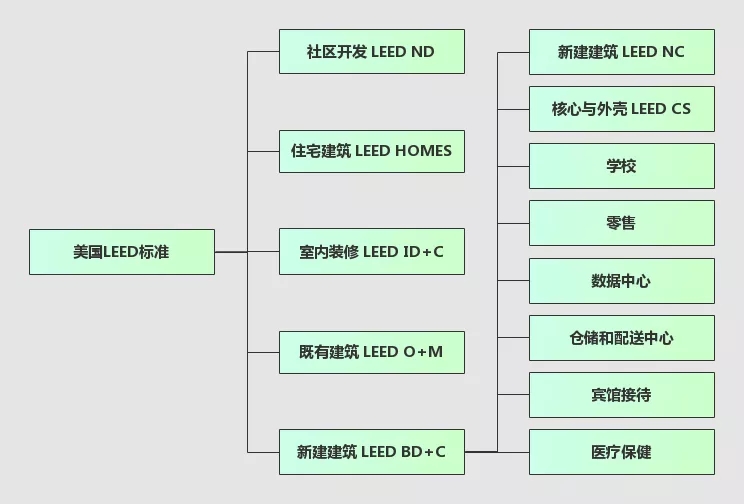 美國LEED標準分為5大類,分別為:新建建筑設計及施工(LEED BD+C)、既有建筑運營及維護(LEED O+M)、室內裝修設計及施工(LEED ID+C)、住宅建筑(LEED HOMES)、社區開發(LEED ND)。其中LEED BD+C又可細分出新建建筑(LEED NC)、核心與外殼(LEED CS)、學校、零售、數據中心等等。