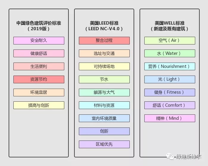 中國綠色建筑評價標準與美國LEED標準類似,主要關注建筑本身的性能,比如節地、節水、節能、節材以及環境保護等(“四節一環保”),并且都是按照申報項目獲得的分數來劃定綠色建筑評價等級,不同的是中國綠色建筑星級認證有效期為2~3年,美國LEED認證終身有效。美國WELL標準則側重探索建筑與其居住者的健康和福祉之間的關系,按照符合的條款數量劃分綠色建筑評價等級,WEEL認證有效期為3年。
