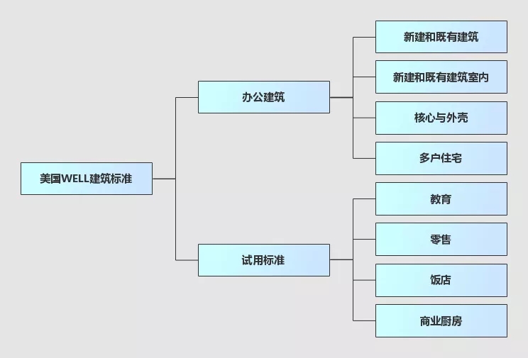 美國WELL建筑標準適用范圍包括:新建和既有建筑、新建和既有建筑室內、核心與外殼。此外WELL還推出試用標準,其適用建筑范圍包括:多戶住宅、教育、零售、飯店、商業廚房。
