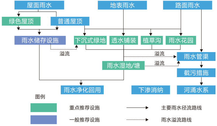 排:利用城市豎向與工程設施相結合、排水防澇設施與天然水系河道相結合、地面排水與地下雨水管渠相結合的方式來實現排放和超標雨水的排放,避免內澇等災害。