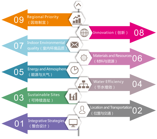 宗旨:LEED評級系統旨在優化利用自然資源,促進資源再生和恢復,最大限度的發揮現代建造工業給人類和環境帶來的各種積極因素,盡量減少消極影響,為居住者提供優質舒適的生活環境。