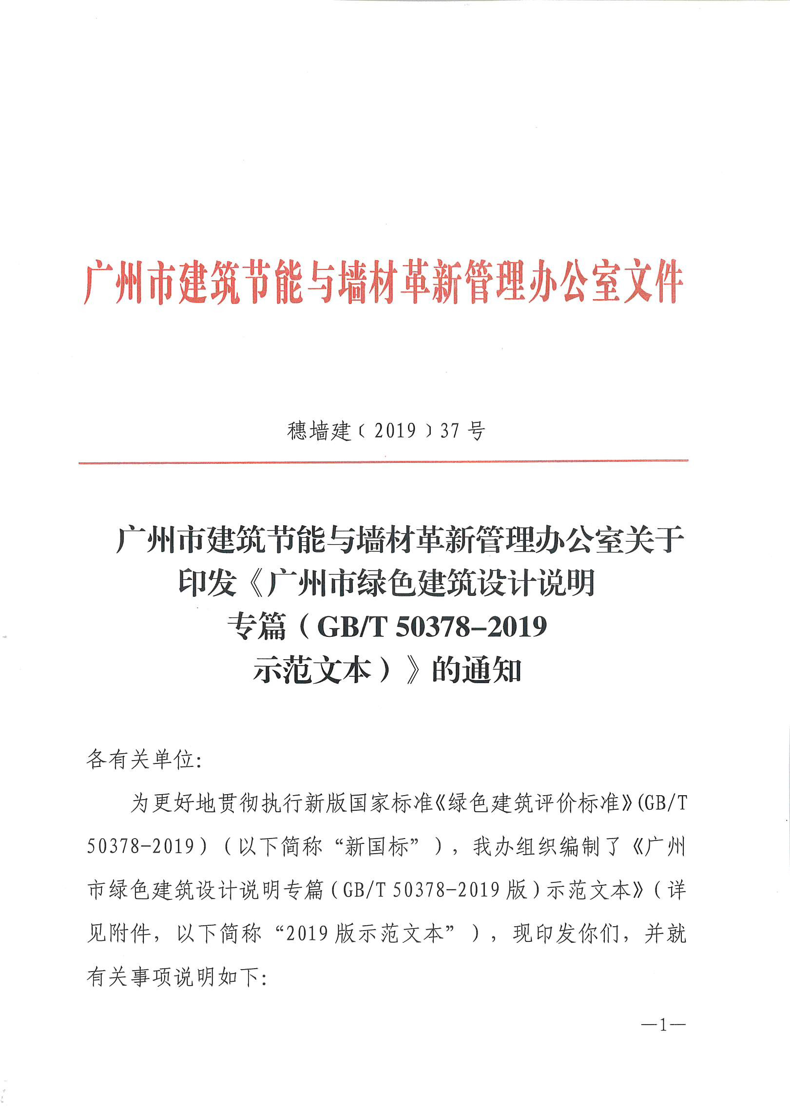 - 廣州市建筑節能與墻材革新管理辦公室關于 印發《廣州市綠色建筑設計說明 專篇(GB/T 50378-2019 示范文本)》的通知