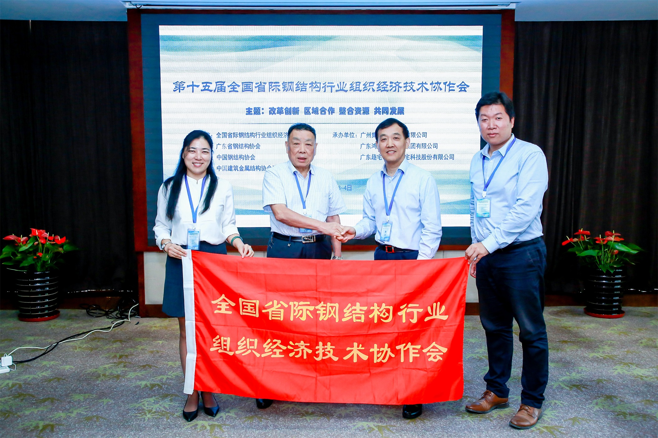廣東省鋼結構協會理事長王仕統親自將會旗交接給上海市金屬結構行業協會副秘書長何連成、葉佳人
