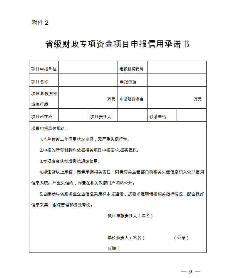 (二)簽訂《省級財政專項資金項目申報信用承諾書》(附件2)。