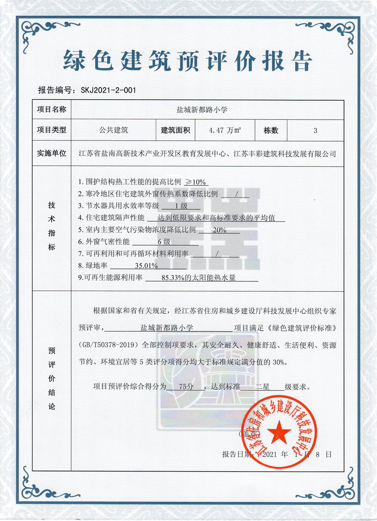 為貫徹落實綠色發展理念,推進綠色建筑高質量發展,鹽城市新都路小學項目于2021年初進行了江蘇省住房和城鄉建設廳科技發展中心組織的首批綠色建筑試點預評價并獲得預評價報告,是我市第一個按照《綠色建筑評價標準》GB/T 50378-2019(以下簡稱“新國標”)進行評價的二星級綠色建筑。