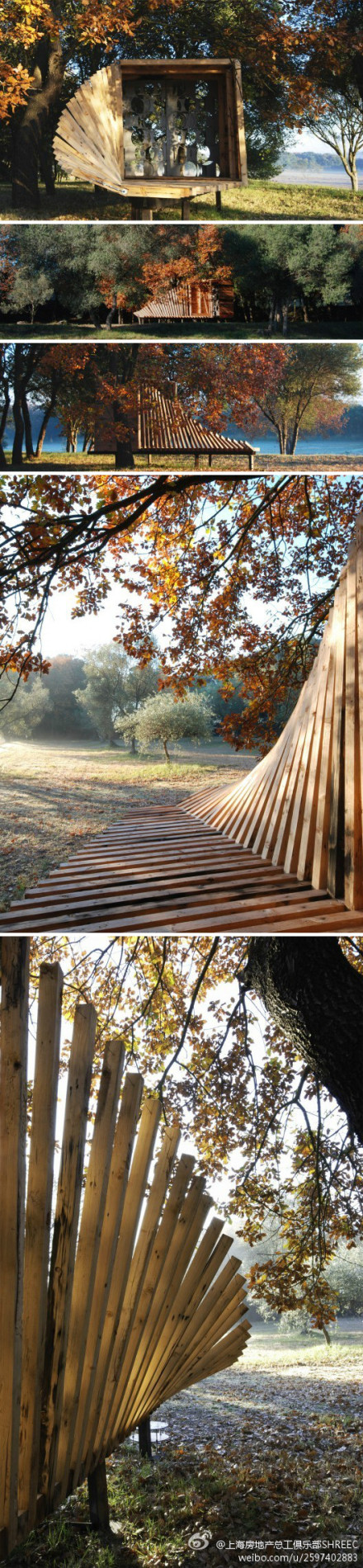 @上海房地產總工俱樂部SHREEC:叢林平臺:在西班牙東北部城市赫羅納的一處叢林中,設計師設計了這個獨具創意的林中平臺。平臺的主要作用是為人提供休息,放松甚至可以小憩的地方,這個建筑的材料主要 用的是回收的建筑廢料,包括木線板,穿孔木材,金屬型材等,所有的這些材料在清潔打磨后重新利用。