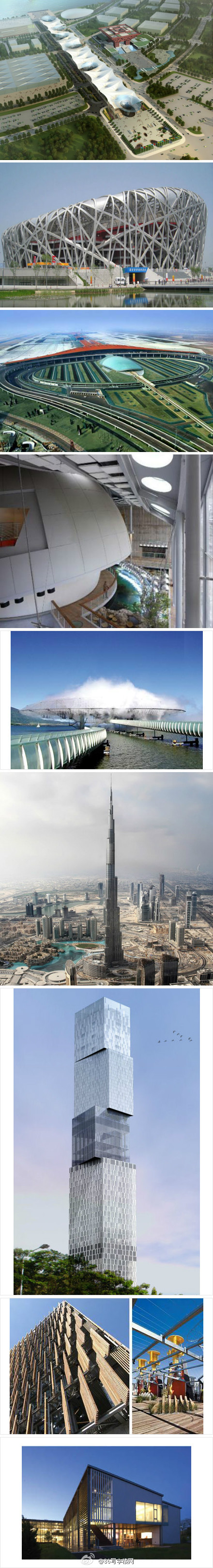 @86寫字樓網:1.世博軸工程中國上海,2.鳥巢中國北京,3.北京首都國際機場3號航站樓,4.美國加州科學館,5.瑞士世博會模糊建筑,6.迪拜大樓,7.印度塔,8.CH2,墨爾本,9.國際愛護動物基金會(IFAW)總部美國馬薩諸塞州。