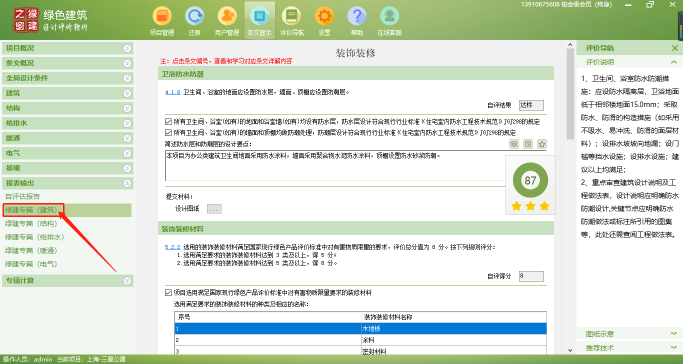 6、實時定位修改相關條文內容;一鍵生成自評估報告、綠建專篇、審查備案表(可直接用于評審資料);;
