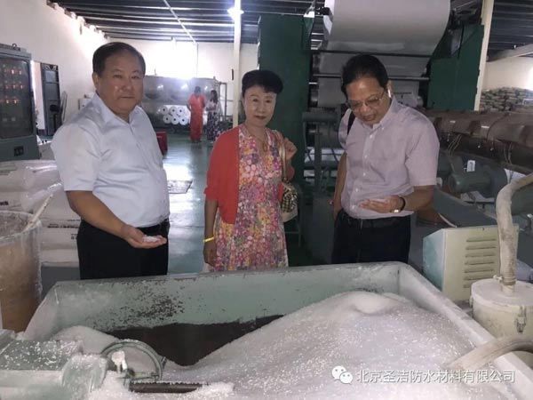中國建筑防水協會兩位副會長瞿培華、羨永彪察看圣潔防水原生原料(左一為羨永彪、中為圣潔董事長杜昕、右一為瞿培華)