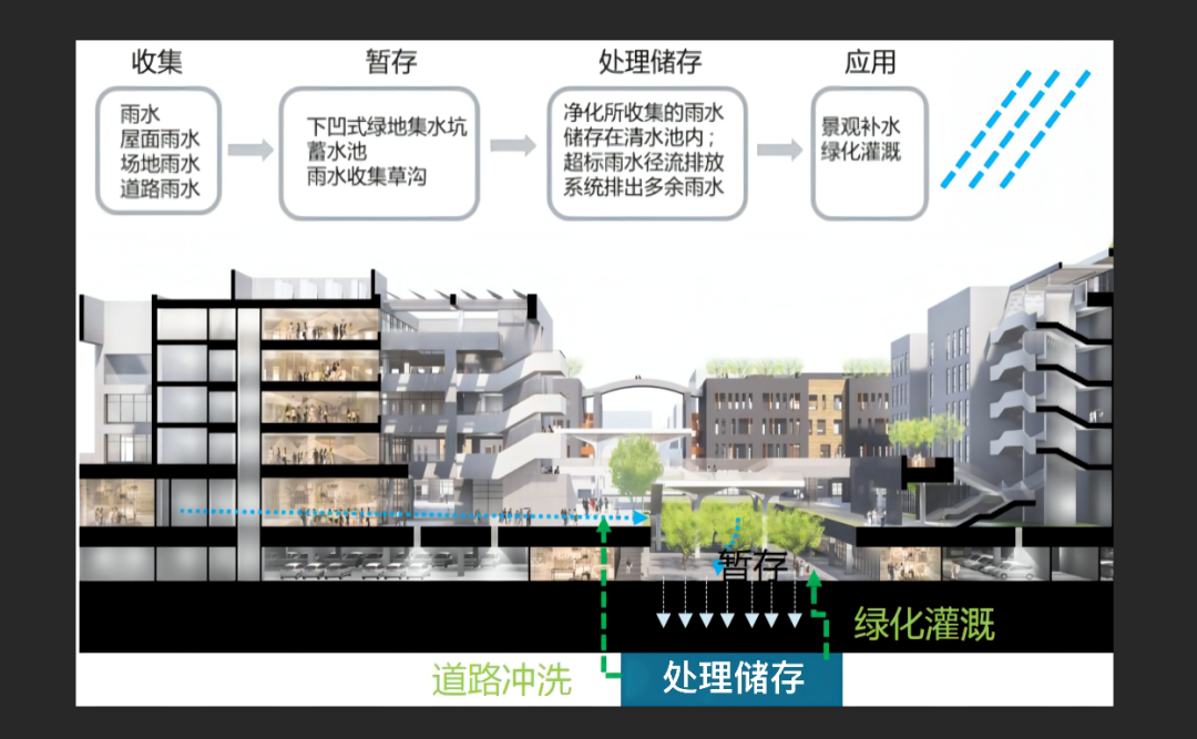 項目在場地利用、能耗、節(jié)水、選材等各方面堅持可持續(xù)設(shè)計,“以人為本” 打造健康建筑,科技創(chuàng)新 “建證”綠色篇章,通過雨水收集系統(tǒng)、雨水調(diào)蓄系統(tǒng)、雨水收集回用系統(tǒng),踐行海綿城市的生態(tài)設(shè)計理念。