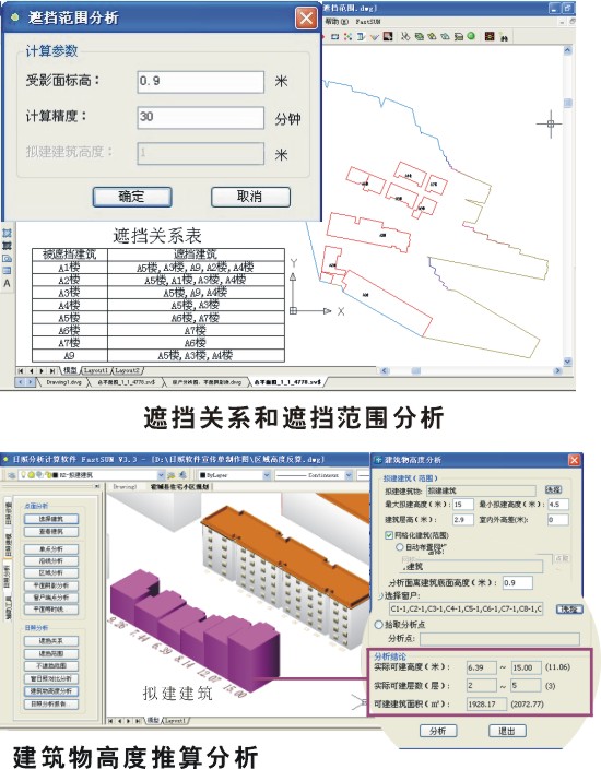擬建分析:擬建建筑位置確定情況下,推算建筑單元高度;高度確定情況下,推算建筑位置或轉(zhuǎn)動(dòng)角度,為建筑方案設(shè)計(jì)提供依據(jù)。