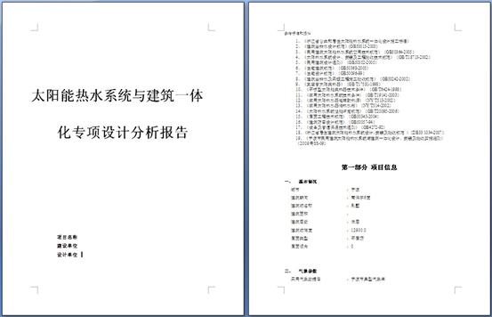 軟件輸出的太陽能熱水建筑一體化專項分析報告,包含項目基本信息、氣候條件、系統設計原件相關參數、分析結論等內容,全面分析所設計系統的情況,符合d范的要求。