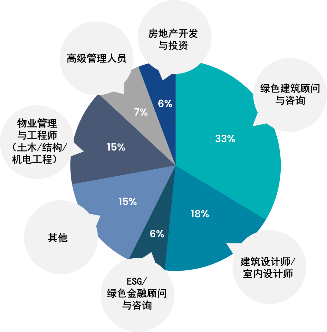 或許你會好奇,究竟哪些工作職能或行業的精英選擇了 LEED Green Associate / AP 這一身份?不難想到,建筑與室內設計、綠色建筑顧問、建筑運營和工程人員等與建筑設計與運維直接相關的行業是持有 LEED 專業人士最多的人群。