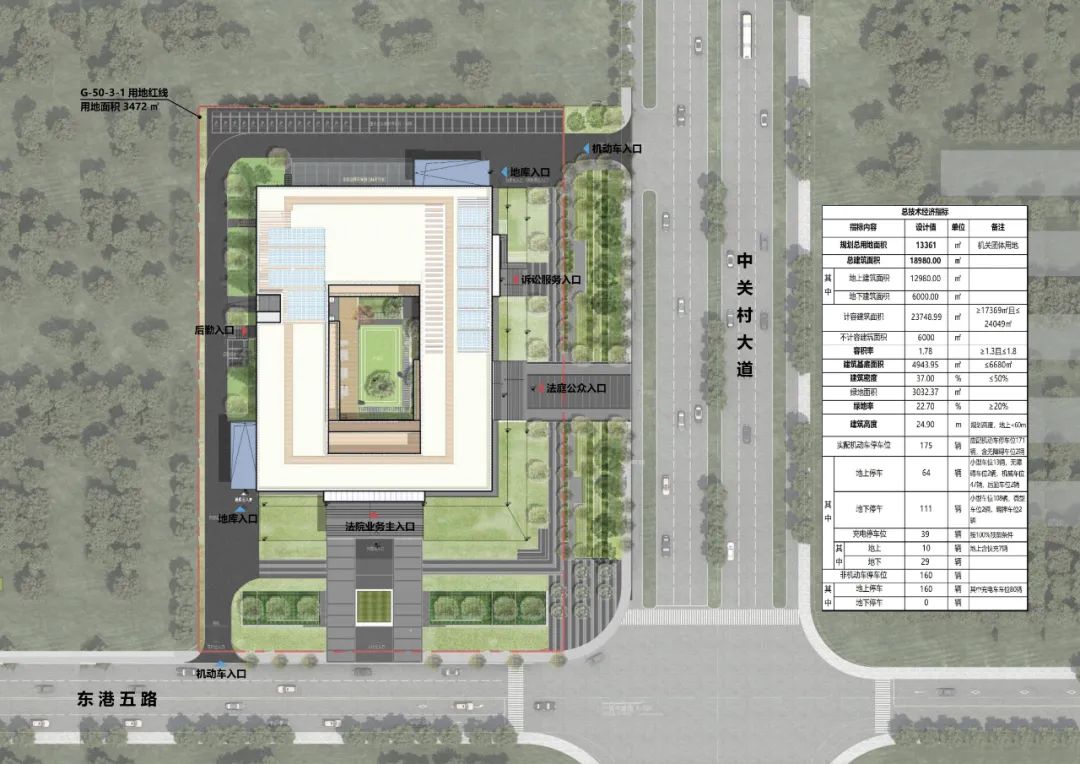 場地地處城市道路交叉口,具備良好的形象城市展示界面。東側的中關村大道道路等級較高,兩側有寬敞的城市綠化帶,可為場地提供景觀資源。在設計時需要著重考慮法院與南側、東側兩個城市界面的關系。