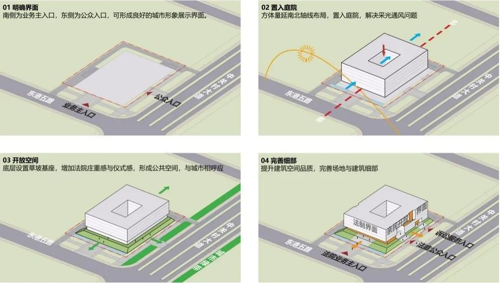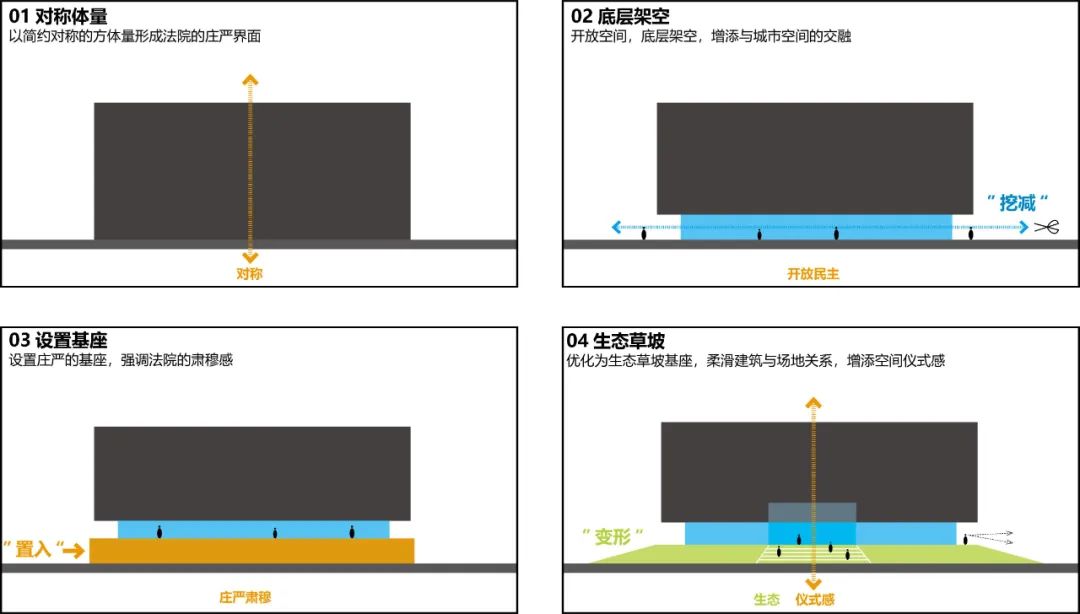 場地南側為辦公業務入口,為法治界面,東側為公眾入口,為城市界面。多方案比選中,我們選擇圍院式建筑形體回應場地,引入中心庭院,提高建筑空間采光、通風及使用舒適性,方形內院形式也與當地的地域傳統建筑格局相呼應,在現代建筑中繼承先人的智慧,延續當地的歷史人文,這是地域的方院、時代的方院,傳承的方院。設置生態草坡基座,柔化建筑與場地的接地關系,增加法院的莊重感與儀式感。同時建筑立面也設置連貫延續的開放公共空間,與生態草坡一同成為法院與城市互動共享交流的場所。