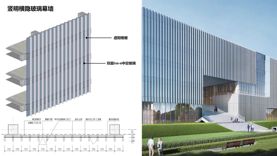 建筑東、西、北立面大體采用豎明橫隱遮陽格柵玻璃幕墻,塑造建筑的虛實體量。