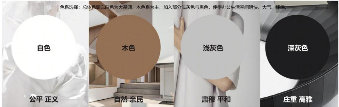 法院室內空間設計延續建筑外部設計理念,內部空間與外部形態相呼應。總體色調以白色為大基調,木色系為主,加入部分淺灰色與黑色,使得辦公生活空間明快、大氣、生態、環保。體現公平、正義、自然、親民、肅穆、平和、莊重、典雅的設計理念。