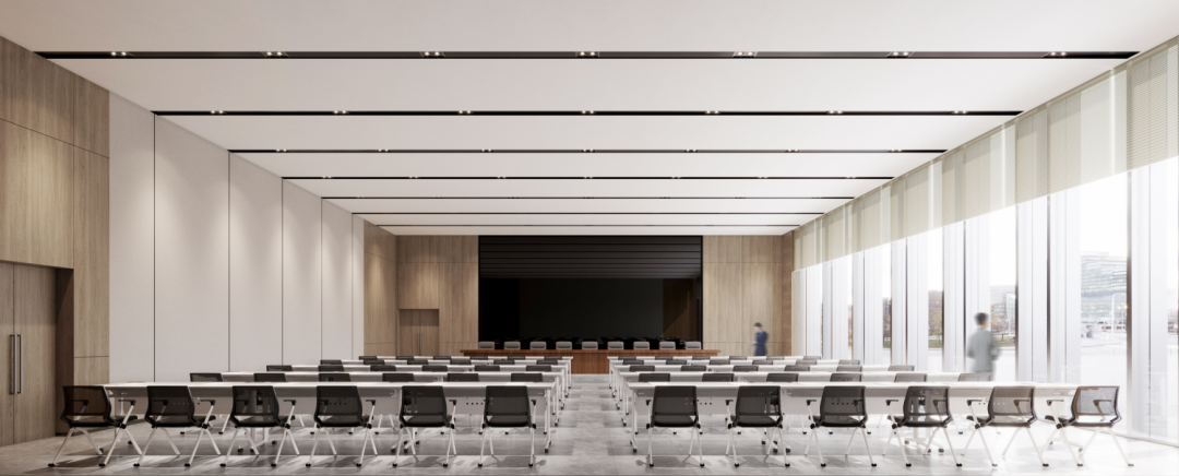 建筑南立面采用漸變式遮陽格柵玻璃幕墻,通過重復與漸變的韻律節奏,使得整個建筑在光影的變幻中展現出大氣而不失細膩的質感。