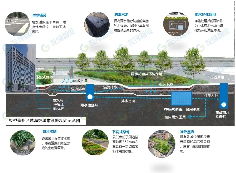 停車場設計參照海綿城市建設標準,采用在屋面上設置綠色屋頂、對人行道和停車位等處進行透水鋪裝、綠化帶設置下沉式綠地等措施,對排水系統、綠地系統、道路系統等區域的雨水進行有效吸納、蓄滲和緩釋。停車場還設置雨水調蓄池,對雨水進行凈化處理,用于綠化灌溉、沖洗路面等,實現對雨水循環利用,有效控制雨水徑流,場地年徑流總量控制率達到70%以上。