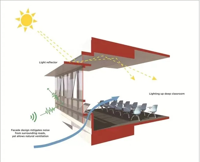 在“香港高等教育科技學院” 柴灣校區中采用了生物氣候幕墻。在中央系統監控下,由窗戶制動器和窗戶觸點控制通風裝置,確保建筑在幕墻關閉時保持密封,并根據室外環境,智能自動調節混合模式通風,為師生提供低能耗且高舒適度的使用體驗。