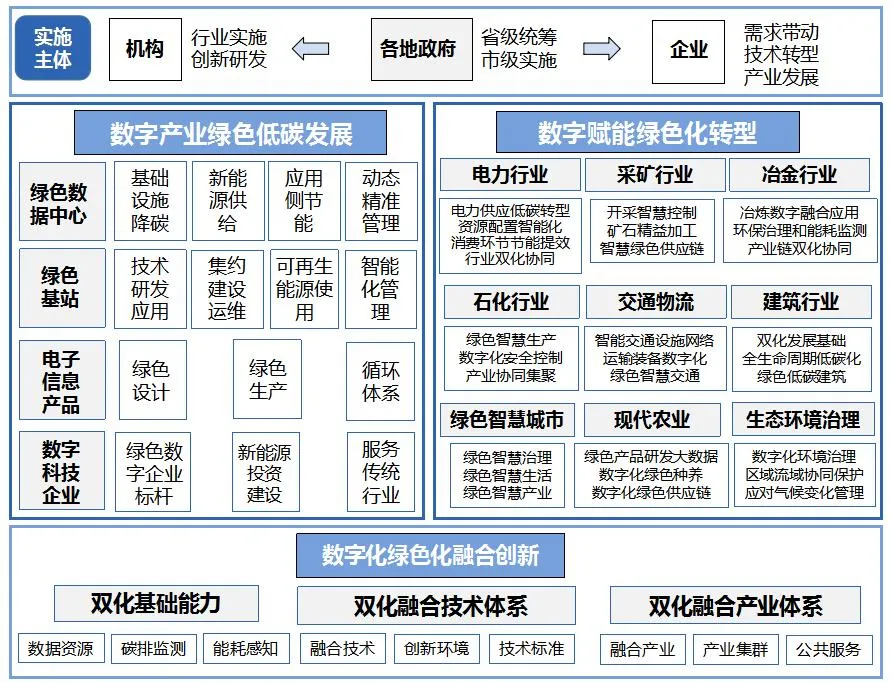 《指南》指明雙化協(xié)同兩大發(fā)力方向:一是要加快數(shù)字產(chǎn)業(yè)綠色低碳發(fā)展,推動數(shù)據(jù)中心、通信基站、電子信息產(chǎn)品等關(guān)鍵領(lǐng)域的綠色化轉(zhuǎn)型。二是要發(fā)揮數(shù)字科技企業(yè)創(chuàng)新作用,促進電力、采礦、冶金、石化、交通、建筑、城市、農(nóng)業(yè)、生態(tài)等九個重點領(lǐng)域的綠色化轉(zhuǎn)型。