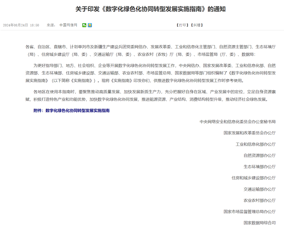時間:2024-09-01 09:19:43 作者:GBWindows 來源:原創(chuàng)文章 閱讀:817內(nèi)容摘要:8月24日,中央網(wǎng)信辦秘書局、國家發(fā)展改革委辦公廳、工業(yè)和信息化部辦公廳、自然資源部辦公廳、生態(tài)環(huán)境部辦公廳、住房城鄉(xiāng)建設(shè)部辦公廳、交通運輸部辦公廳、農(nóng)業(yè)農(nóng)村部辦公廳、市場監(jiān)管總局辦公廳、國家數(shù)據(jù)局綜合司聯(lián)合印發(fā)《數(shù)字化綠色化協(xié)同轉(zhuǎn)型發(fā)展實施指南》(以下簡稱《實施指南》)。《指南......8月24日,中央網(wǎng)信辦秘書局、國家發(fā)展改革委辦公廳、工業(yè)和信息化部辦公廳、自然資源部辦公廳、生態(tài)環(huán)境部辦公廳、住房城鄉(xiāng)建設(shè)部辦公廳、交通運輸部辦公廳、農(nóng)業(yè)農(nóng)村部辦公廳、市場監(jiān)管總局辦公廳、國家數(shù)據(jù)局綜合司聯(lián)合印發(fā)《數(shù)字化綠色化協(xié)同轉(zhuǎn)型發(fā)展實施指南》(以下簡稱《實施指南》)。