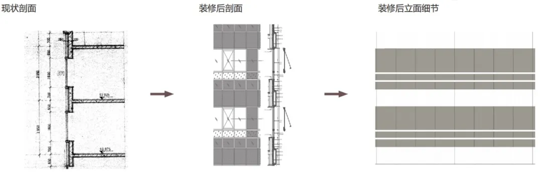 B.建筑中部:根據(jù)原始結(jié)構(gòu),優(yōu)化立面橫向分格,精細(xì)立面設(shè)計(jì)。
