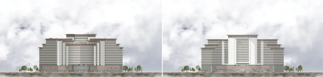 外立面改造設(shè)計(jì),采用經(jīng)典三段式造型,通過(guò)對(duì)建筑結(jié)構(gòu)、功能、外觀的綜合考慮,簡(jiǎn)化古建形式比例,分別對(duì)建筑屋檐、建筑中部、建筑底座三部分進(jìn)行表現(xiàn)。建筑頂部采用弧形出挑屋檐,形成舒展穩(wěn)定的屋檐形象;建筑中部整體設(shè)計(jì)以橫向元素為主,形成穩(wěn)定舒展的建筑形象,整個(gè)建筑猶如環(huán)抱二環(huán),與環(huán)境交相呼應(yīng);建筑基座采用橫向石材肌理,增加光影、豐富立面,形成整體典雅、大氣、時(shí)尚的外立面形象。