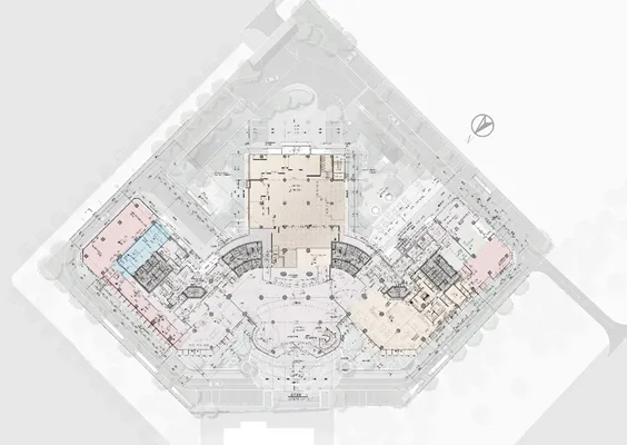 設(shè)計(jì)通過(guò)梳理場(chǎng)地內(nèi)部原有空間布局及交通流線,使之更加明晰、簡(jiǎn)捷、合理,以滿足商務(wù)酒店需要。地塊主要出入口設(shè)置在東中街,并在朝陽(yáng)門北大街設(shè)置出口。酒店主入口位于建筑西北側(cè),酒店大堂以、全日制餐廳及各功能位置保持不變,客人可便捷到達(dá)。辦公入口調(diào)整至景觀中心,良好的環(huán)境提升了辦公的品質(zhì);公寓入口移至地塊南側(cè),緊鄰項(xiàng)目西側(cè)次入口,避免公寓人員流線對(duì)啤酒花園的干擾。地面避免酒店各流線混行,停車泊位采用地面和地下相結(jié)合方式,充分利用好地下空間。