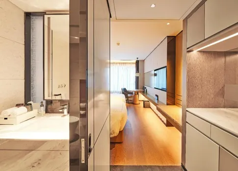 室內(nèi)裝修以高檔、舒適為設(shè)計(jì)原則,分公共區(qū)域、客房區(qū)域和行政樓層三個(gè)部分進(jìn)行設(shè)計(jì)。裙房部分為公共區(qū)域,包含酒店大堂、前臺(tái)接待、全日制餐廳、咖啡廳等公共服務(wù)區(qū);客房區(qū)域設(shè)有三件套和四件套客房;行政樓層提供更為高品質(zhì)的客房環(huán)境。室內(nèi)精裝匯集形式、質(zhì)感、材料、光影等于一體,表達(dá)空間的品質(zhì)和精神。