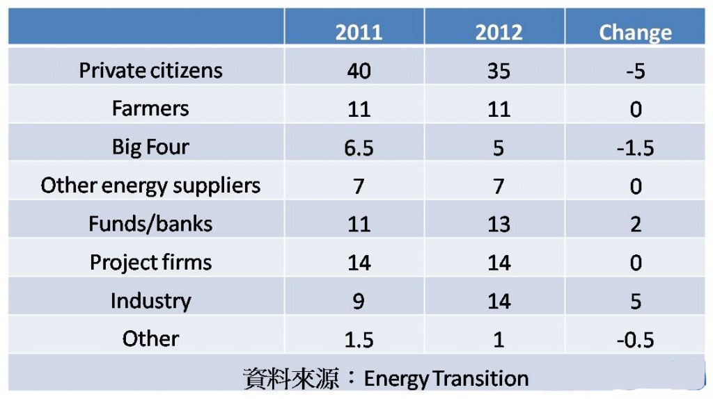 以德國而言,2012年,其所有的可再生能源之中,有35%來自于個人,其中大部分是家戶屋頂裝設太陽能電池,有11%來自于農民,也就是說在農田既種田也種電,設置太陽能電池,或是插上一只風力發電機。個人與農民加起來,將近占了德國可再生能源的半數。