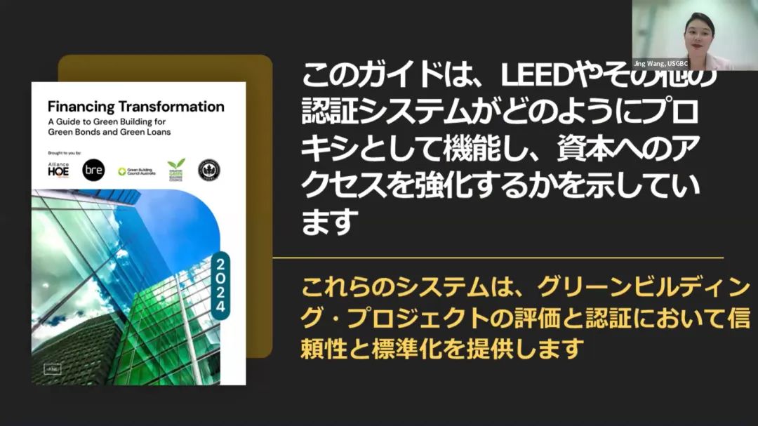 8 月 27 日,LEED 北亞區(qū)與房地產(chǎn)碳風(fēng)險監(jiān)控機構(gòu)(CRREM)以及日本新興咨詢公司 GOYOH 聯(lián)合主辦了圍繞綠色金融這一話題的網(wǎng)絡(luò)研討會,來自 Eminence Partners、CSR 設(shè)計環(huán)境投資顧問、森大廈,以及日本政策投資銀行的專家們?yōu)閰⑴c者分享了全球及日本綠色金融的趨勢和前景,吸引了約 100 名在線參與者。LEED 北亞區(qū)副總裁王婧在研討會上介紹了 USGBC 與幾大國際機構(gòu)聯(lián)合發(fā)布的白皮書《融資轉(zhuǎn)型:一份綠色建筑進行綠色融資和綠色貸款的實踐指南》,該白皮書旨在填補并明確金融機構(gòu)與資產(chǎn)所有者針對綠色建筑與綠色融資之間的聯(lián)系的理解差距;王婧還以 Alphabet 和 Prologis 的綠色融資戰(zhàn)略為例,強調(diào)了通過應(yīng)用綠色金融工具,我們可以更快速有效地推動更可持續(xù)的未來。