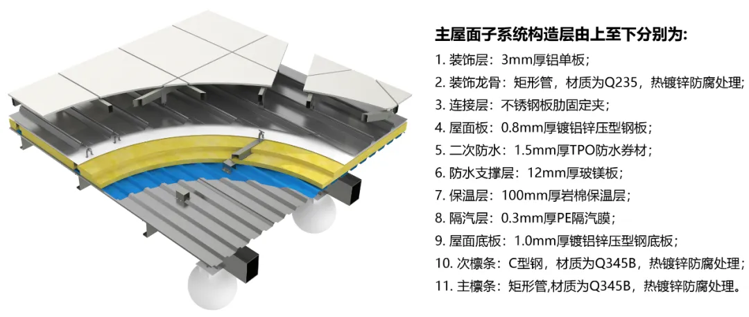 機場屋面主系統采用了420型咬合的高肋鋼板金屬屋面,是完成航站樓建筑封閉、防水、保溫、隔聲的主要系統。420型咬合金屬面板上設一層金屬裝飾屋面,保證航站樓造型和外觀的完整性,同時起到通風屋面和隔熱的作用。金屬裝飾層通過夾具夾在420型咬合金屬屋面板的板肋上,不穿透金屬屋面,減少漏水隱患,同時增強了屋面系統的整體抗風性能。