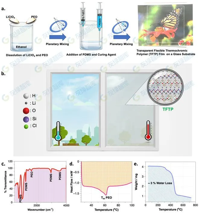 PDMS是一種無法與大多數其他聚合物混溶的聚硅氧烷。研究團隊利用鹽析現象,通過使用易解離的鹽來即通過鹽析現象來改善PDMS基質中PEO鏈的可混溶性。同時,通過使用固化劑和高溫快速交聯,制備了具有高度均勻性的熱致變色聚合物共混物(TFTP)。通過傅里葉變換紅外光譜(FTIR)、差示掃描量熱儀(DSC)和熱重分析(TGA),研究團隊對TFTP膜進行了成分表征和熱穩定性分析。TFTP的紅外光譜顯示出與PDMS和PEO相對應的明顯特征峰,表明其中的三個組分沒有發生化學反應,而只是進行了物理混合。熱分析結果顯示TFTP膜在300°C以下沒有觀測到明顯的重量損失,這表明TFTP膜具有滿足智能窗戶應用的熱穩定性。