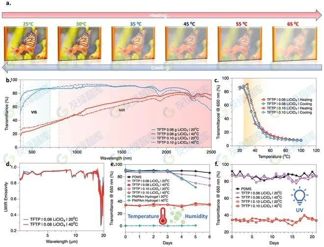 圖2A展示了不同溫度下涂在玻璃板上的TFTP薄膜的外觀變化。與通常呈現棕黃色色調的二氧化釩薄膜以及其他無機熱致變色材料相比,TFTP薄膜在不透明狀態時顯示出視覺上較為舒適的白色。通過可見-近紅外光譜可以觀察到:當溫度升高時,TFTP樣品表現出從360nm(可見光)到2500nm(近紅外)的透射率差異。該混合物的可見光透射率(Tvis)和太陽光調制能力(ΔTsol)與現有熱致變色水凝膠相當。