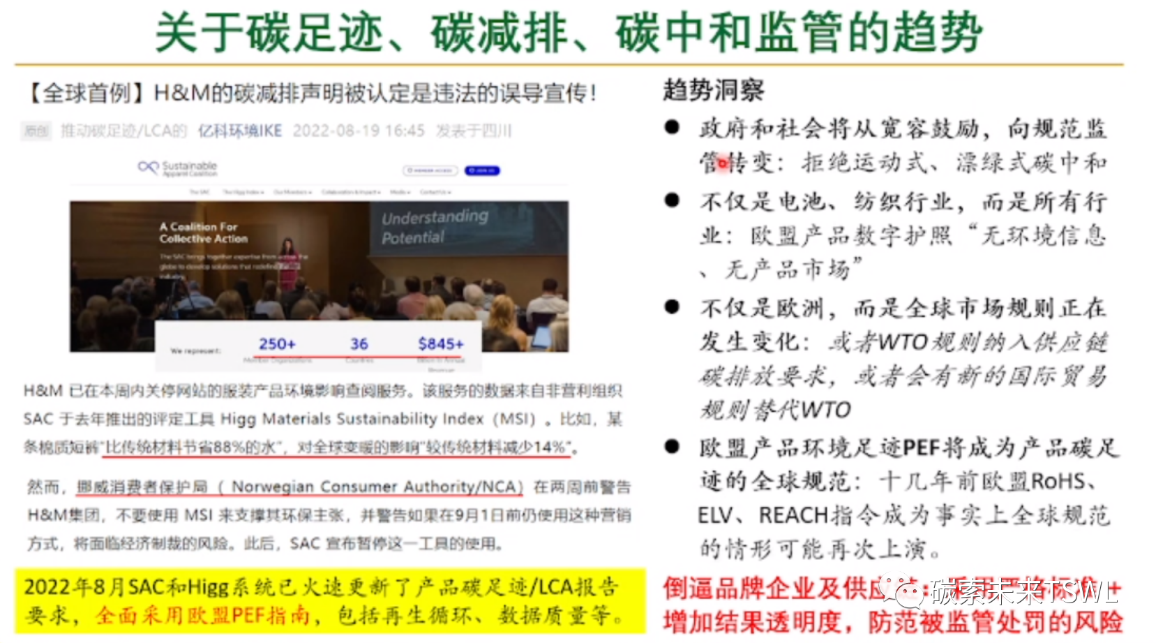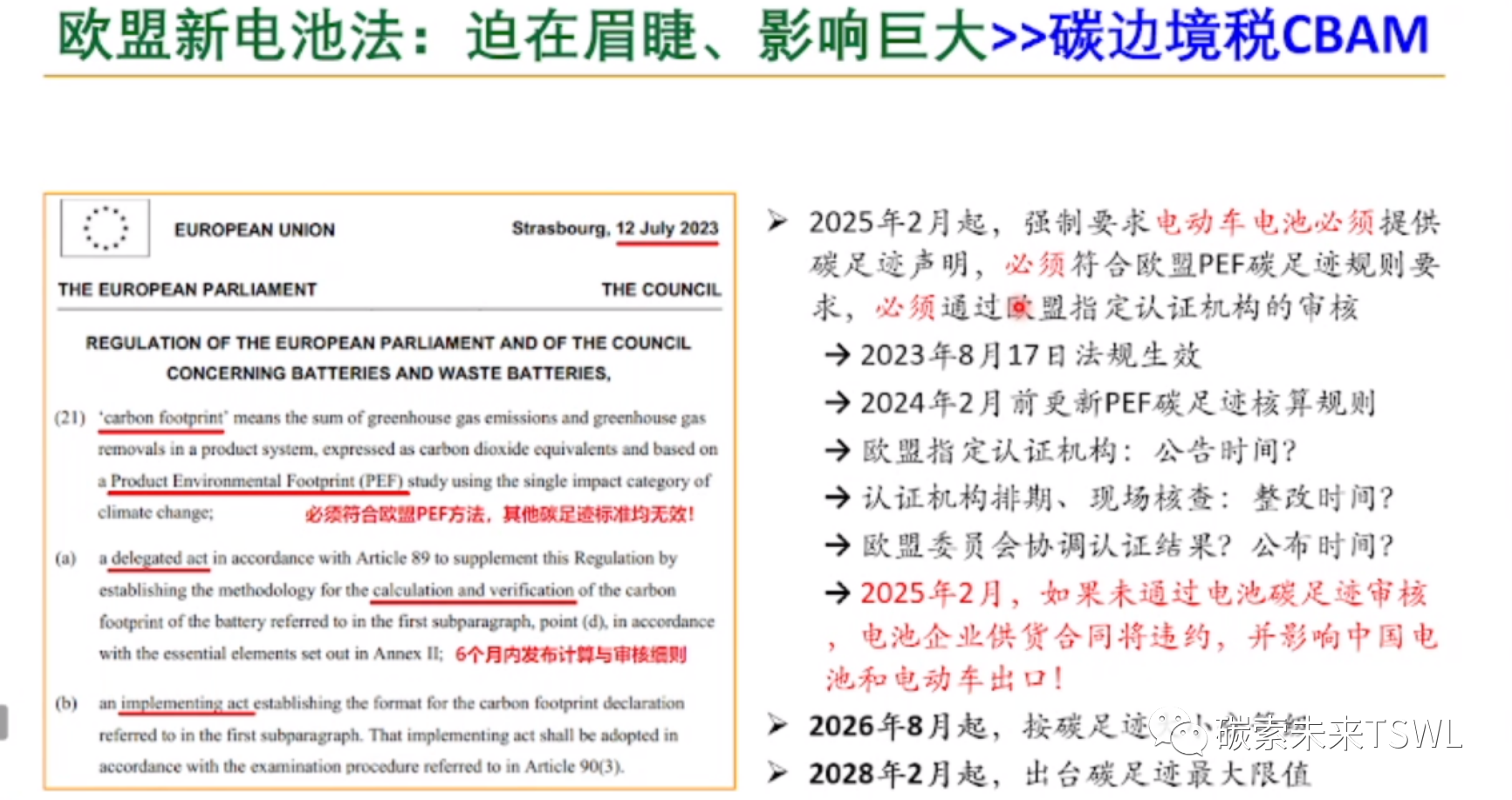1、通過編制碳足跡報告,企業可以發現溫室氣體排放的熱源,制定符合自身實際狀況及經濟適用的減排計劃和方案。 2、通過碳足跡報告,企業可以向相關利益方報告企業的碳足跡以及減排的計劃、行動和進展。 3、經過第三方機構的審核碳足跡報告更加具備公信力。第三方的審核在一些項目執行中是強制的,例如歐盟的碳關稅將加入強制的第三方驗證。 產品環境足跡(PEF)是歐盟提出的一種計算產品總體環境影響的方法學。根據《新電池法規》,出口歐盟市場的電池和電動汽車,必須要完成符合歐盟PEF標準的電池碳足跡認證。產品碳足跡正在成為國際貿易壁壘的關鍵之一,歐盟PEF有可能滲透到全球產業鏈,逐步成為碳足跡全球標準。