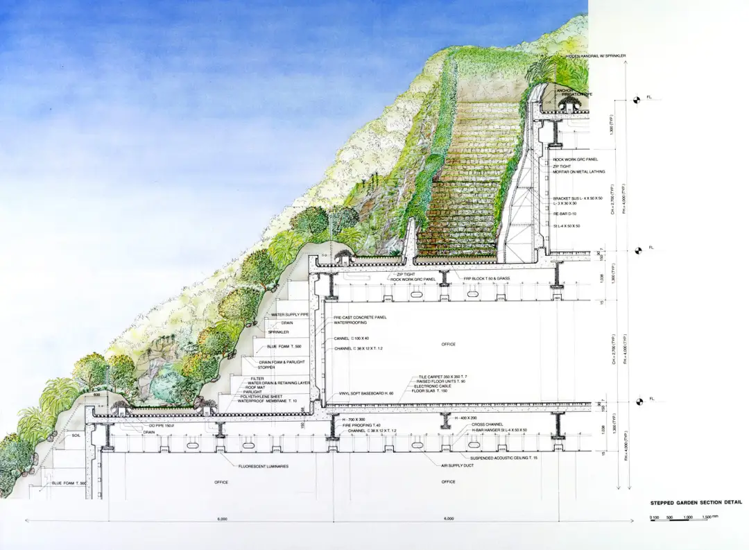 這個綠色項目是一個混合體,三面都有優(yōu)雅、低調(diào)的立面,第四面,也就是南面,是一個山巒起伏的公共公園,可以稱為建筑的屋頂、正面、背面,或者更確切地說是正面。1990年,該市迫切需要一座新的政府辦公大樓。按照最初的設(shè)想,這個大型綜合體將占用兩公頃天神中央公園的一半,而天神中央公園是這個人口密集的商業(yè)區(qū)僅存的稀疏綠地之一。