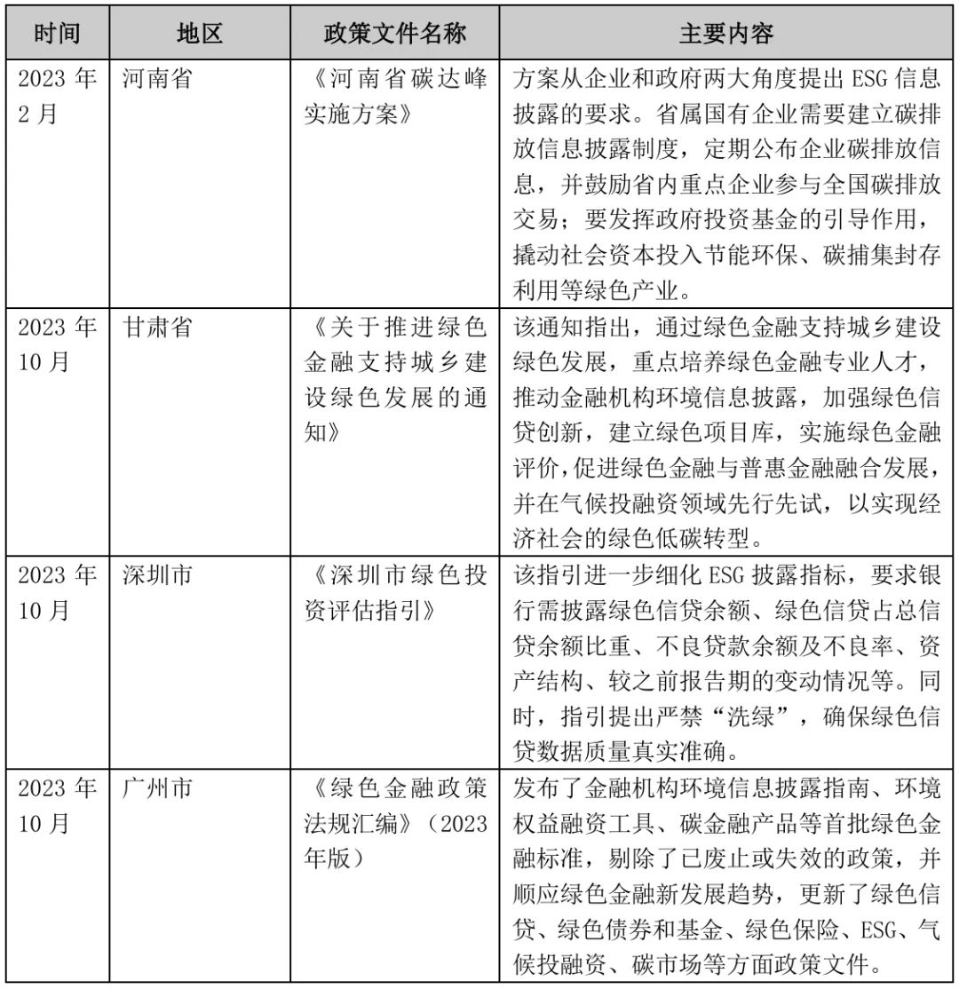 2023年,很多省市地方層面根據最新的中央政策文件的指導要求,對ESG相關信息披露進行了進一步的指導。2023年2月,河南省發布《河南省碳達峰實施方案》,方案從企業和政府兩大角度提出ESG信息披露的要求:省屬國有企業需要建立碳排放信息披露制度,定期公布企業碳排放信息,并鼓勵省內重點企業參與全國碳排放交易;要發揮政府投資基金的引導作用,撬動社會資本投入節能環保、碳捕集封存利用等綠色產業。2023年10月,深圳市發布的《深圳市綠色投資評估指引》進一步細化ESG披露指標,要求銀行需披露綠色信貸余額、綠色信貸占總信貸余額比重、不良貸款余額及不良率、資產結構、較之前報告期的變動情況等。同時,該指引提出嚴禁“洗綠”,確保綠色信貸數據質量真實準確。