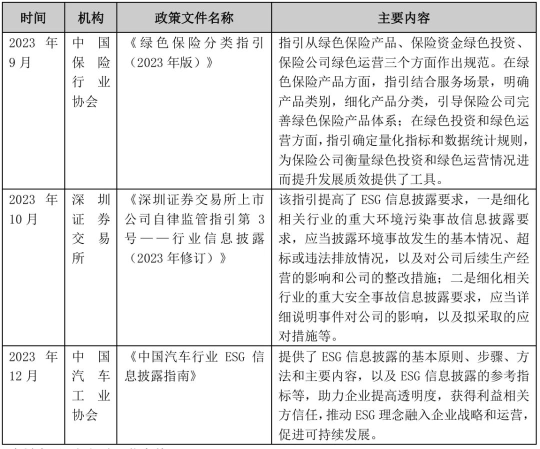 2023年10月,深交所發布的《深圳證券交易所上市公司自律監管指引第3號——行業信息披露(2023年修訂)》提高了ESG信息披露要求,要求上市公司詳細披露重大環境污染和安全事故信息,包括事故發生的基本情況、事件對公司的影響、公司的整改措施等。同時,在中國保險行業協會、中國汽車工業協會等行業自律組織的推動下,相關行業ESG信息披露標準陸續出臺。