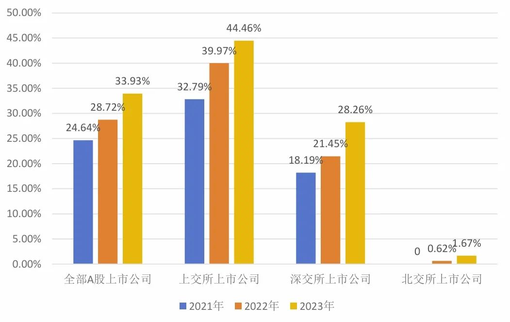 2021年至2023年,我國A股上市公司發布獨立ESG/社會責任報告數量從24.64%[1]上升至33.93%,各交易所披露比率如圖1所示??傮w來說,目前政策引導加強、市場需求擴大、投資者意識增加,使得上市公司對ESG管理重視程度提高,但依然有較大的提升空間。