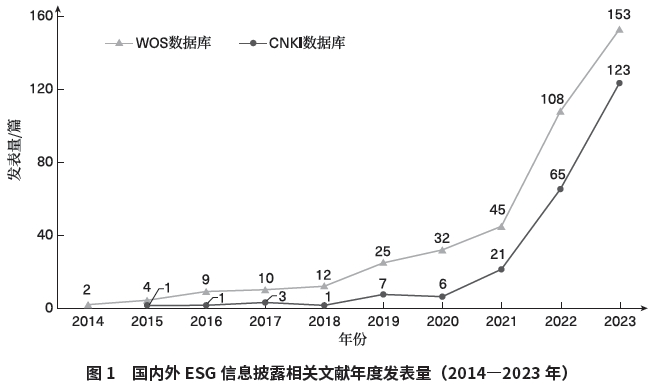在應對全球氣候變化、落實可持續發展目標(SDGs)的時代背景下,推動ESG已成為經濟發展的趨勢。ESG集中體現了環境保護、社會責任、公司治理三位一體的可持續發展理念,是確定組織整體績效的關鍵指標以及可持續金融的重要驅動力。在ESG生態體系中,信息披露是基礎設施,ESG評級與投資均建立在ESG披露之上。披露內容主要體現為三點:環境(E)方面,公司為保護環境所做出的努力;社會(S)方面,公司如何管理與社區、消費者和員工等利益相關者的關系;治理(G)方面,審查公司的管理團隊、股東權利和內部控制機制。隨著ESG理念的廣泛傳播和ESG投資規模的日趨擴大,利益相關者對ESG信息的真實性、可比性的要求越來越高。國內外學者大多已經認識到ESG信息披露對推動可持續發展目標平穩實施、增強企業綠色競爭力的作用并開展了廣泛的研究,“ESG信息披露”相關學術研究逐年增多,全面分析ESG信息披露相關文獻對于進一步拓展和深化研究領域至關重要。本文綜合使用文獻計量法和內容分析法對China National Knowledge Infrastructure(以下簡稱CNKI)和Web of Science(以下簡稱WOS)數據庫源中與ESG信息披露相關的628篇文章的文獻特征與研究內容進行計量分析,總結該領域的研究現狀、識別研究熱點并對該領域未來的研究進行展望。
