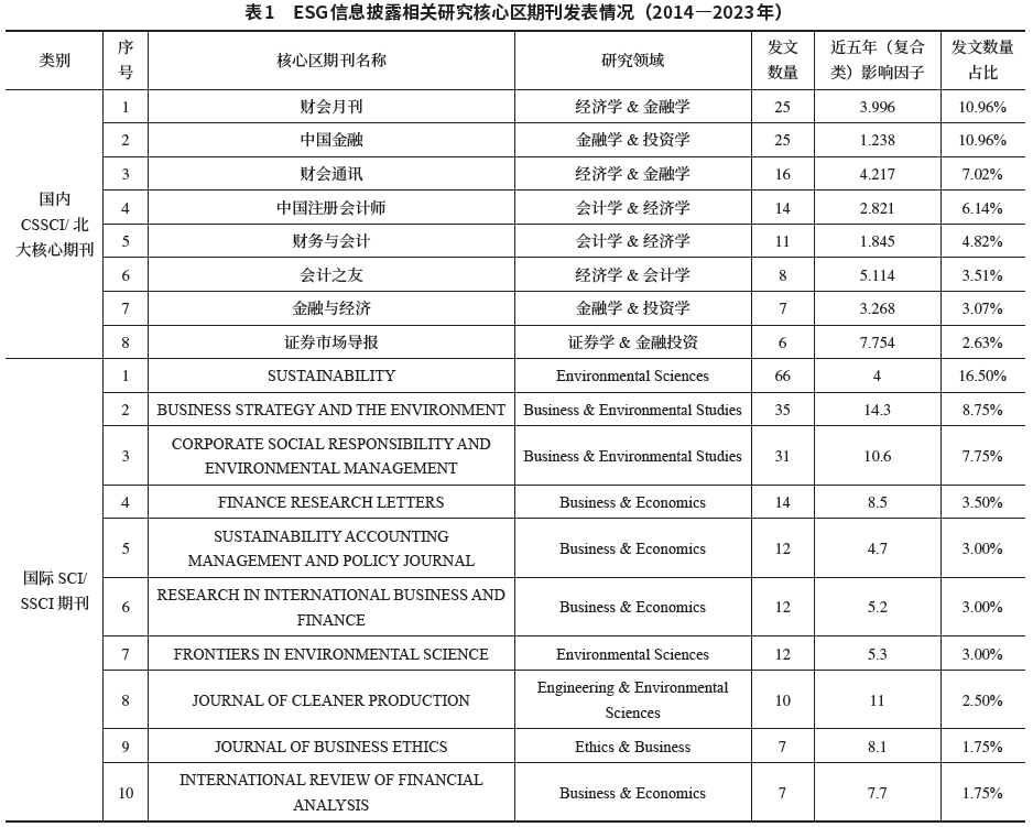 通過統計國內228篇CSSCI/北大核心文獻及國際400篇SCI/SSCI文獻的期刊來源,發現刊載相關研究的期刊數量較多,但分布較為零散。其中,國內文獻發表在85本期刊,僅刊載1篇文獻的期刊有53本,占比62.4%;國際文獻發表在120本期刊,僅刊載1篇文獻的期刊有64本,占比53.3%。由布拉德福定律可知,期刊可被分為核心區、相關區和邊沿區,依據埃格提出的計算方法,核心區期刊數量計算公式為P=2ln(eE×Y),其中:P為核心數量,E為歐拉系數,E=0.5772,Y為期刊的最大載文量。計算可知,國內核心區期刊數量為P=2ln(1.781×25)=7.59,即發文數量排名前8位的國內期刊處于核心區;國際核心區期刊數量為P=2ln(1.781×66)=9.53,即發文數量排名前10位的國際期刊處于核心區。統計核心區期刊發表情況如表1所示,可看出國內核心區期刊集中于經濟學、金融學與會計學領域,主要探討企業內部控制、盈余管理和融資約束等;而國外期刊大多集中于Business & Economics和Environmental Sciences領域,關注商業金融、環境科學、綠色可持續發展等。國內核心區期刊在會計/審計學科的影響力指數排名較為靠前,國外核心區期刊在Business, Finance和Environmental Studies的JCR分區中大多為Q1和Q2,表明以ESG信息披露為主題的研究受到學術界的關注與重視。