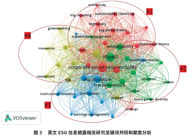英文文獻的48個高頻關鍵詞被歸納成4個聚類,形成810條連接線,總關聯強度為3019。①聚類1:ESG披露對公司財務績效的影響。紅色區域主要涵蓋“corporate social-responsibility”“financial performance”“cost”“firm value”等關鍵詞,體現當前研究者較為關注ESG信息披露對公司價值、收益的影響,研究涉及合法性和利益相關者理論,因此該區域還出現了“legitimacy”“stakeholder theory”等關鍵詞。②聚類2:公司內部治理因素對ESG信息披露的影響。綠色區域主要包含“impact”“responsibility”“corporate governance”“directors”等關鍵詞,揭示學者們對公司內部治理因素,如董事構成、性別多樣性等的持續探索,對董事會中女性占比的研究較多。③聚類3:ESG信息披露質量的影響因素。藍色區域主要包括“ESG disclosure”“quality”“ownership”“institutional investors”等關鍵詞,展現研究者持續關注公司所有權結構、機構投資者等因素對ESG信息披露質量的影響,且研究多為實證研究。④聚類4:ESG信息披露對公司可持續性的影響。黃色區域主要含有“sustainability”“social responsibility”“environmental disclosure”“risk”等關鍵詞,表明目前研究者深入挖掘ESG信息披露對公司可持續發展的推動作用,較為關注環境方面的信息披露以及對公司風險的作用效果。